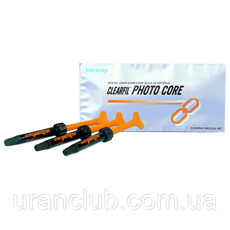Светоотверждаемый композит, плотно наполнен и специально разработан для восстановления коронковой части зуба. Материал полностью нолимеризуеться на глубину 7 мм в течение всего 40 сек., Что является уникальным. В клиницистов есть возможность упростить процедуру использования медных колпачков, матриц и избыточных слоев материала, особенно при использовании специальной системы колпачков Kuraray Core Build Ups. Clearfil Photo Core после затвердевания препарируется так же как и дентин, является рентгеноконтрастным и не прилипает к инструменту при нанесении его в полость. Он также может быть нанеcений с помощью Centrix-аппликатора. Имея компрессионную прочность 334 МПа, Clearfil Photo Core идеально подходит для маленьких и больших реставраций на поздравительных и депульпированных зубах.